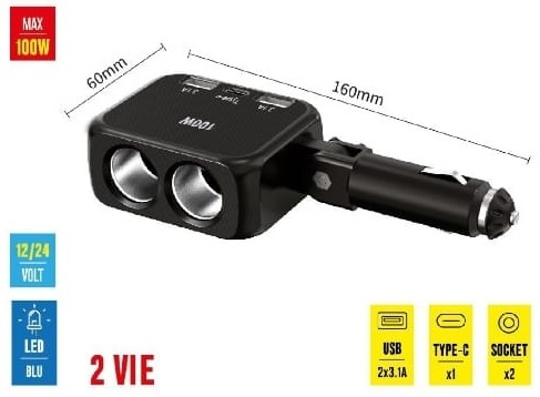 SDOPPIATORE PER ACCENDISIGARI A 2 VIE CON 2 X USB + 1 X TYPE-C 12/24V MAX 100W