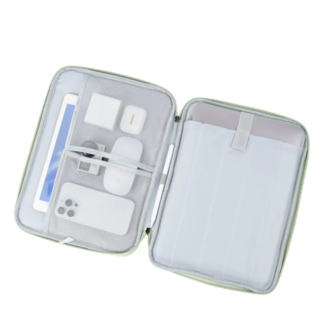 La fodera interna floccata in velluto di cristallo offre una protezione eccezionale contro graffi e danni. Il design a strati della borsa semplifica la conservazione di laptop e accessori mantenendoli organizzati e di facile accesso. La cerniera garantisce una chiusura sicura, proteggendo i tuoi dispositivi dalla caduta. Divisori interni e cinghie elastiche aiutano a organizzare lo spazio mantenendo i dispositivi in ​​posizione.