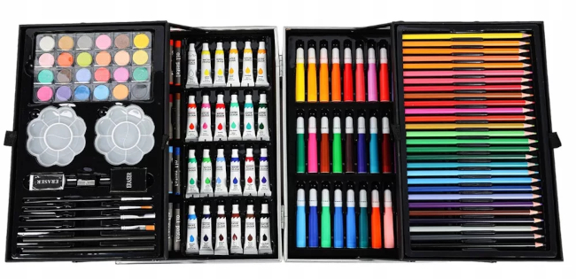 Contenuto: 33 pennarelli, 24 pastelli a cera, 24 colori acrilici da 6ml, 24 acquarelli, 28 matite colorate, 4 pennelli, 2 matite HB, 3 tavolozze, 2 gomme, 1 temperino