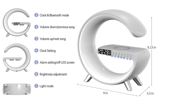 Questo dispositivo innovativo combina ricarica wireless (10W), suono 3D, radio e lettore di schede microSD, rendendolo perfetto per qualsiasi interno