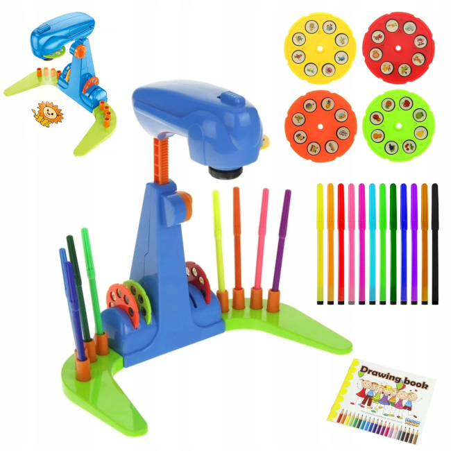 Pennarelli + quaderno inclusi: oltre al set con proiettore e diapositive, sono inclusi 12 pennarelli colorati e un quaderno per disegni. Tutto ciò che ti serve per iniziare a divertirti è incluso. Un comodo supporto per penne e diapositive ti aiuterà a rimanere in ordine e ad avere sempre a portata di mano gli strumenti necessari